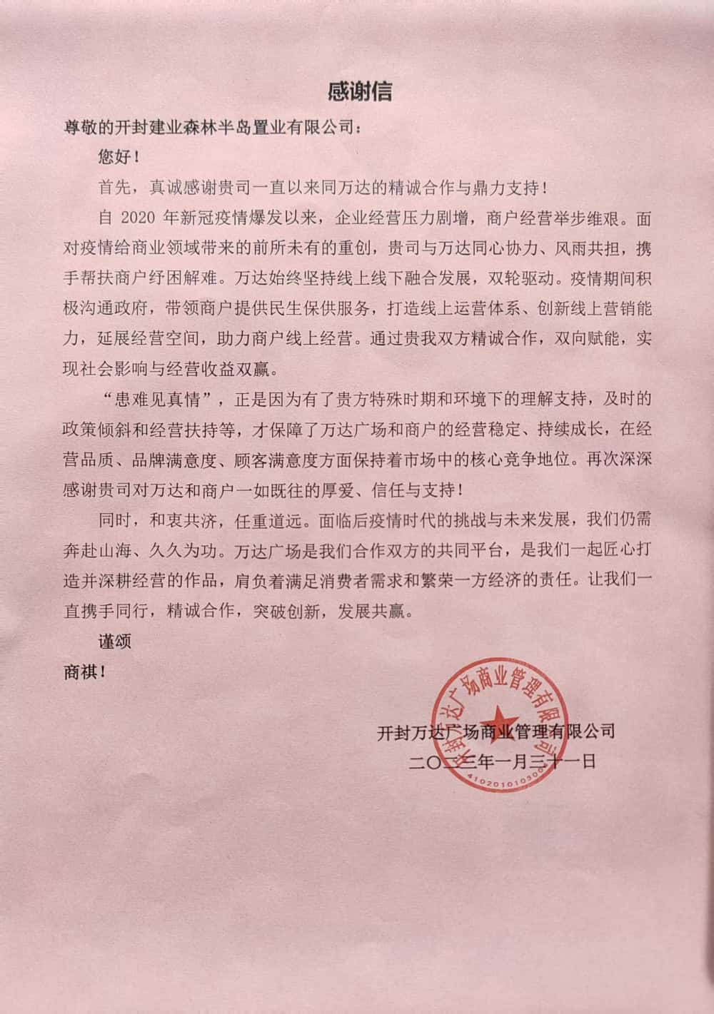 - 2023年2月1日,集团收到来自开封万达广场商业管理有限公司送来的感谢信。信中真诚感谢大宏集团一直以来与万达的精诚合作和鼎力支持,在过去三年疫情的特殊时期和环境下,集团及时给予的政策倾斜和经营扶持,保障了开封万达广场的经营稳定、持续成长。希望未来在双方...