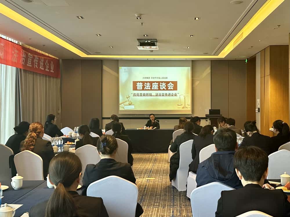 为深入贯彻党的二十大会议精神,弘扬法治理念,深化“法律”六进,有效增强全社会学法、遵法、守法、用法意识。3月7日,三八国际劳动妇女节来临之际,大宏集团工会联合开封市中级人民法院在大宏喜来登酒店共同举行“优化营商环境,法治宣传进企业”普法座谈会。市中级法院民二庭庭长、妇委会主任李翠莲,市中级法院少审庭庭长李妍,市中级法院政治部人事处处长、妇委会委员刘欣,市中级法院机关党委办公室主任、妇委会委员刘丹丹,大宏集团董事长黄梅,大宏集团工会主席蔡娅蕾,大宏集团法务部经理张双双和大宏集团人力行政部经理王伟丽出席了本次活动。大宏集团总部、大宏地产公司、大宏商业公司、大宏物业公司、大宏居然之家、大宏万达广场和大宏喜来登酒店的员工代表共同参加了此次活动。